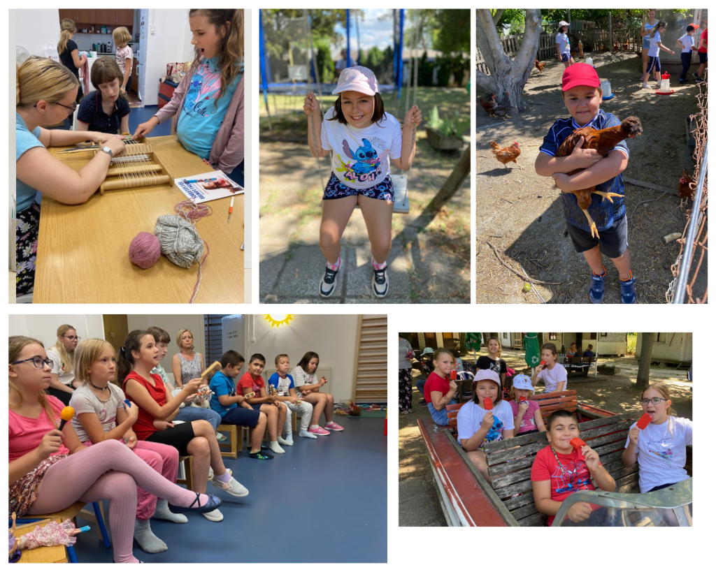 A hét során csodás dolgok készültek: a gyerekek megismerkedtek a szövés művészetével, így színes kisszőnyegek és tarisznyák kerültek ki kezeik közül. A gyöngyfűzés sem maradt ki, és örömmel mondhatjuk: a fiúk is belevetették magukat a munkába – büszkén viselték az elkészült karkötőket, nyakláncokat.